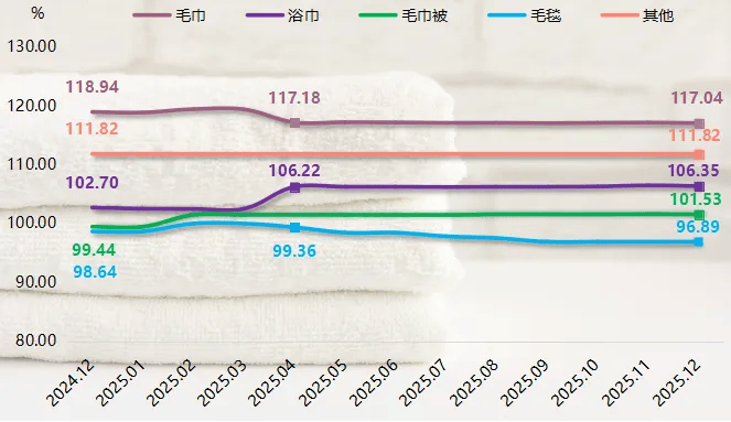 细分来看,2025年,各分项指数同比走势分化,功能性、品质化产品更具价格韧性,而传统品类则面临一定下行压力。其中,毛巾类价格指数在高位小幅回调,12月收于117.04点,同比下降1.60%,反映市场供应充足、竞争加剧导致价格承压;浴巾类指数表现相对坚挺,12月指数为106.35点,同比上涨3.56%,显示消费升级带动中高端浴巾需求持续释放;毛巾被类指数维持温和上行态势,12月指数收报于101.53点,同比上升2.11%,表明季节性备货与产品功能升级支撑价格稳中有升;毛毯类指数同比下滑1.78%,凸显替代品冲击下的价格下行压力;其他类指数始终稳定在111.82点,整体运行平稳。