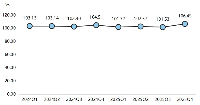 2025年,高阳纺织产业竞争力指数先降后升,四季度指数为106.45点,同比增长1.86%,较一季度增长4.60%。