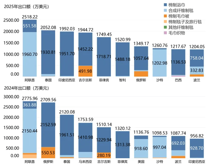 出口方面,2025年,受全球需求疲软、贸易壁垒加剧及海外库存高企等因素影响,我国毛巾类纺织品出口总额为44.32亿美元,同比减少13.18%。其中,河北省毛巾类纺织品出口逆势增长,出口总额达3.13亿美元,同比增长8.78%,占全国出口总额的7.06%,高阳县作为河北毛巾类纺织品核心产区,贡献份额稳中有升。