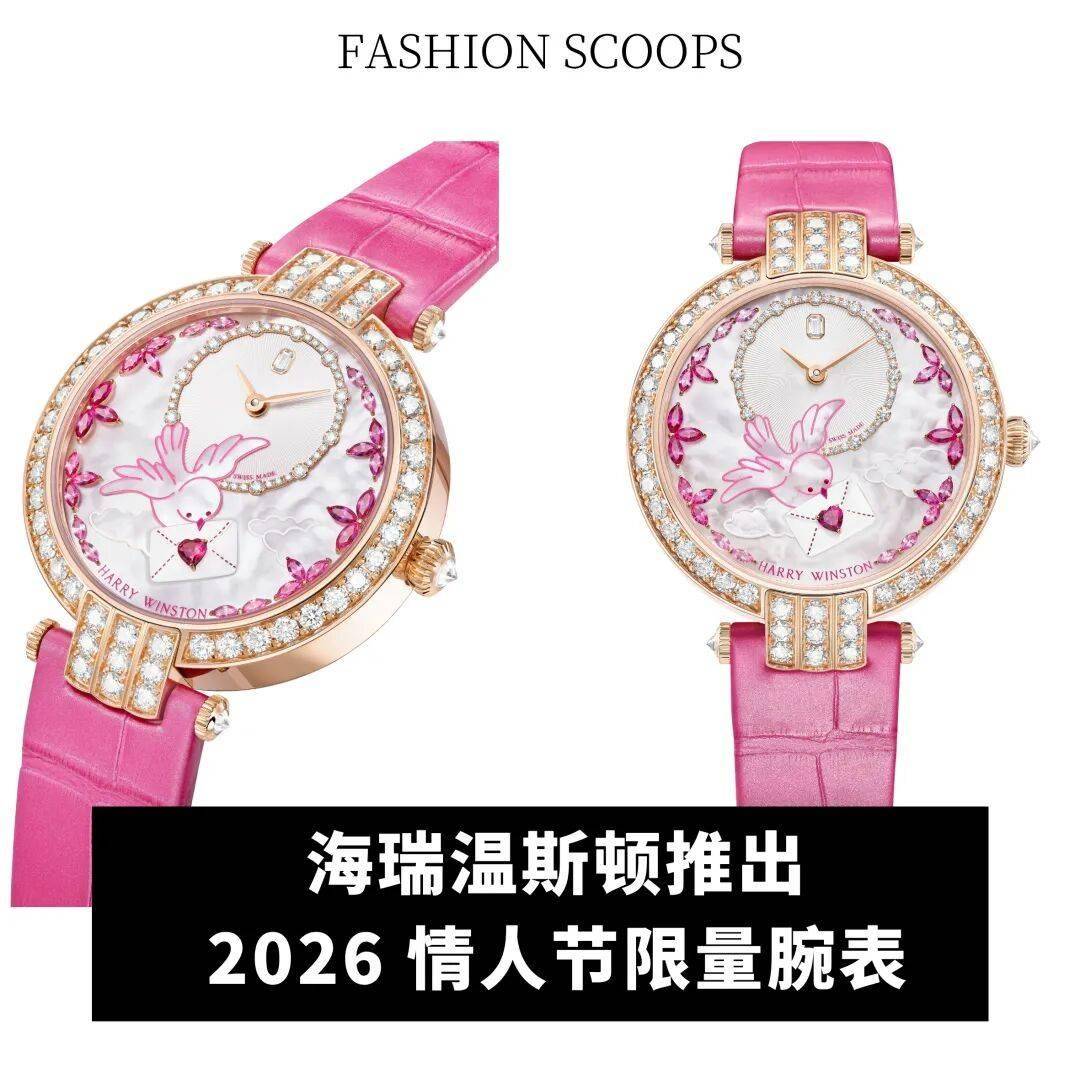 海瑞温斯顿为迎接 2026 年情人节,推出卓时 Premier 系列情人节特别款腕表。这款腕表延续品牌自 2016 年起的浪漫传统,以玫瑰金打造,表盘饰有珍珠母贝镶嵌的飞翔小鸟与云朵图案,小鸟喙衔以红宝石封缄的情书信封,象征爱的传递。表盘融入白色珍珠母贝背景,并镶嵌钻石、红宝石及粉色蓝宝石,延续品牌经典锦簇镶嵌工艺。12 时位置镶嵌一颗祖母绿型切工钻石,致敬品牌高级珠宝传承。